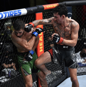 Round 2 – Rodriguez still chopping the leg. Holloway digs to the body. Rodriguez lands with the jab. He’s matching Holloway in the punching output. Right hand for Rodriguez. Holloway answers with a combination. Rodriguez to the leg again. Holloway with a right to the chin. Back and forth on the feet. Rodriguez misses a spinning kick. Holloway continues working the body. Holloway the one pressing the action now, and Rodriguez’s volume slowing a bit. Rodriguez continues working the leg. Rodriguez dropping the hands. Holloway starting to lead the way, but Rodriguez still ripping off powerful punches and chopping the legs. Slick head movement against the fence for Rodriguez, and he just misses a big elbow. Holloway going to the body. High kick blocked. Jab for Holloway. Right to the body.Rodriguez backs to the cage. Holloway with a knee to the body. He moves inside but backs away. Rodriguez misses a big elbow and slips to the floor. Holloway follows at the bell. MMA Junkie gives it to Holloway, 10-9.