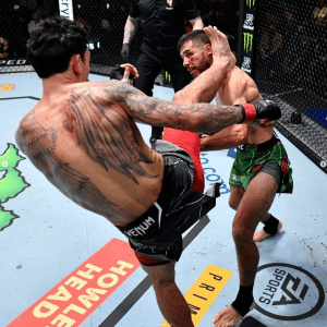 Round 5 – Show of respect to start the round before they start teeing off again. Rodriguez spinning kick to the body. He lands a big right hand. Rodriguez still has pop in his hands, and he kicks to the body, as well. Knee lands from Holloway. He’s punching to the body, as well. My goodness the output from both fighters. Holloway with another knee inside. Rodriguez covers well and battles off the cage. Holloway walking forward and firing punches to the head and body. Acrobatic kick from Rodriguez misses, but he lands a big punch as he jumps up, but Holloway falls on top, and now Rodriguez is on his back again. Perfect sweep from the back, and he takes the top spot. Holloway rolls for an arm, but it’s not there. Holloway scrambles and moves back to his feet. Elbow inside from Rodriguez. Holloway controlling from the outside. Holloway backss away, and he’s got some damage around the right eye. Rodriguez with an overhand right, but Holloway jabs back. Holloway complains of an eye poke, and we take a brief break before resuming with less than a minute. Holloway clinches, but Rodriguez with a nice elbow as they break. Rodriguez spinning kick stuffed, and Holloway clinches. They finish there. MMA Junkie gives the final round to Rodriguez, 10-9, but awards the fight to Holloway, 48-47.