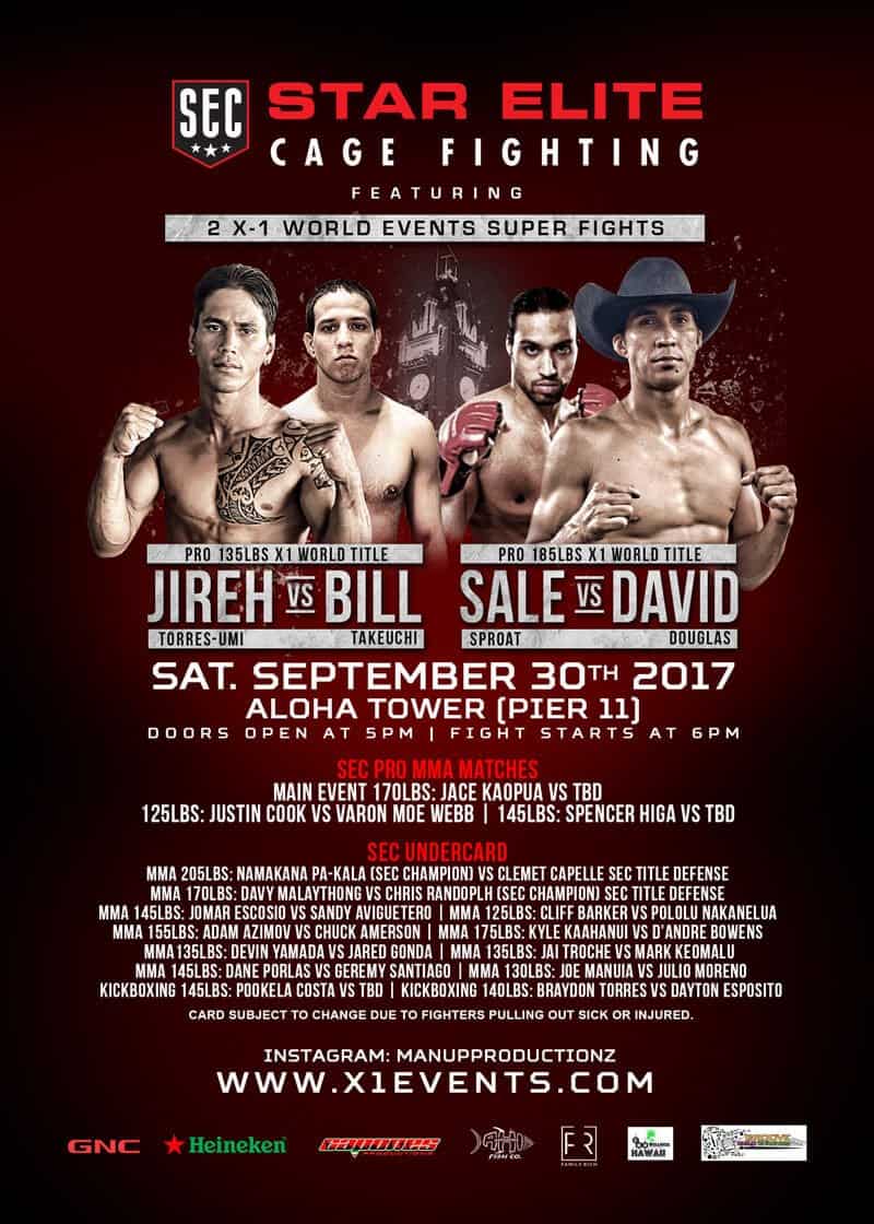 X1 will be back at Aloha Tower the location of many fights this time with Star Elite Cage Fighting as their Wing Man. The card looks solid and a night of local MMA not to missed. Headlining this fight are the two newest X-1 Champions Bill Takeuchi and Sale Sproat both getting a quick opportunity to put their stamp on the X1 belt and up the classification to defending X1 Champions.