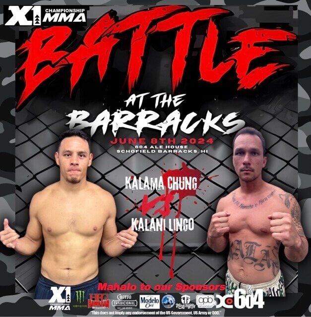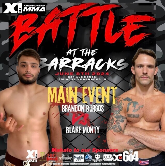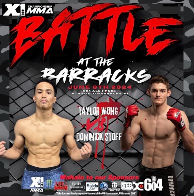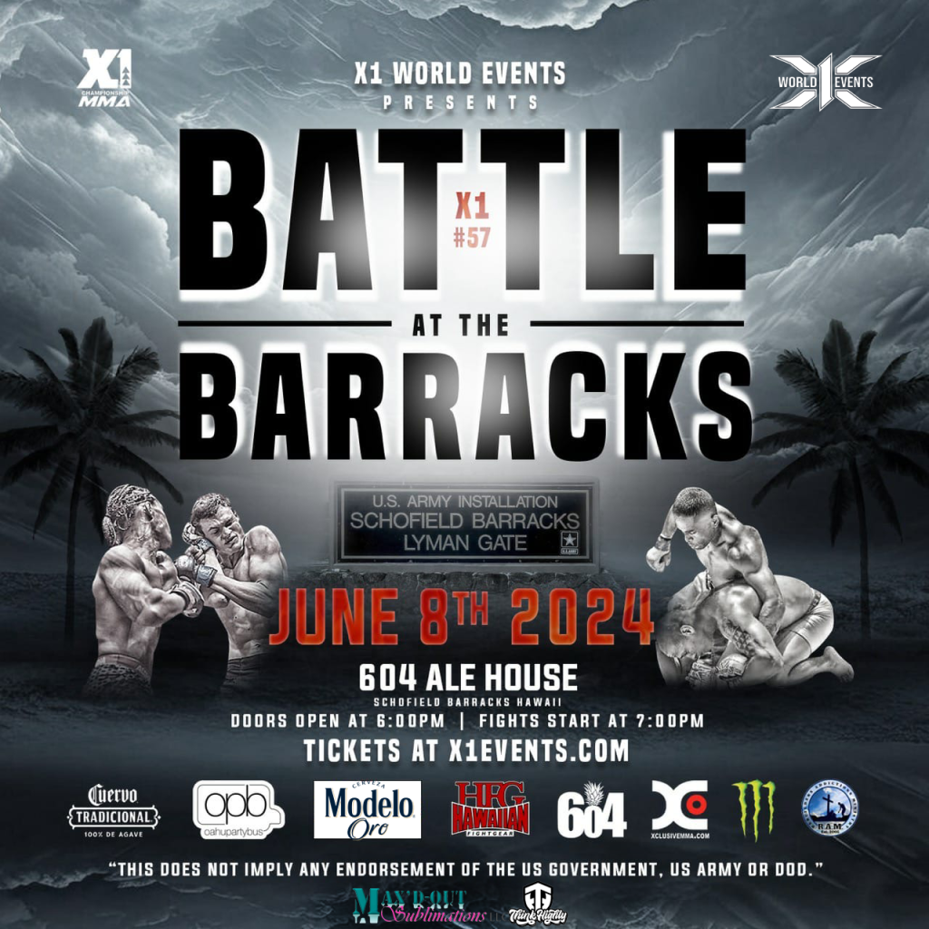 X1 World Events presents X1#57: Battle at the Barracks! Join us for an electrifying night of amateur MMA action at X1#57 on June 8, 2024, hosted at 604 Ale House, Schofield Barracks!