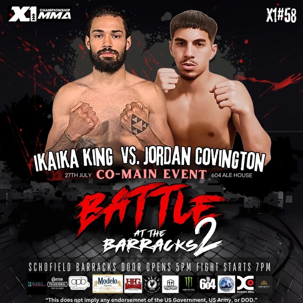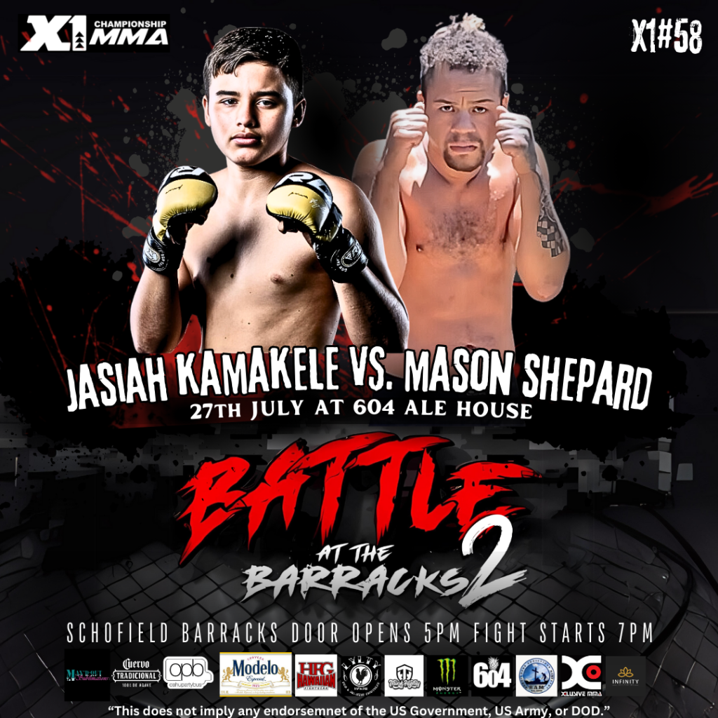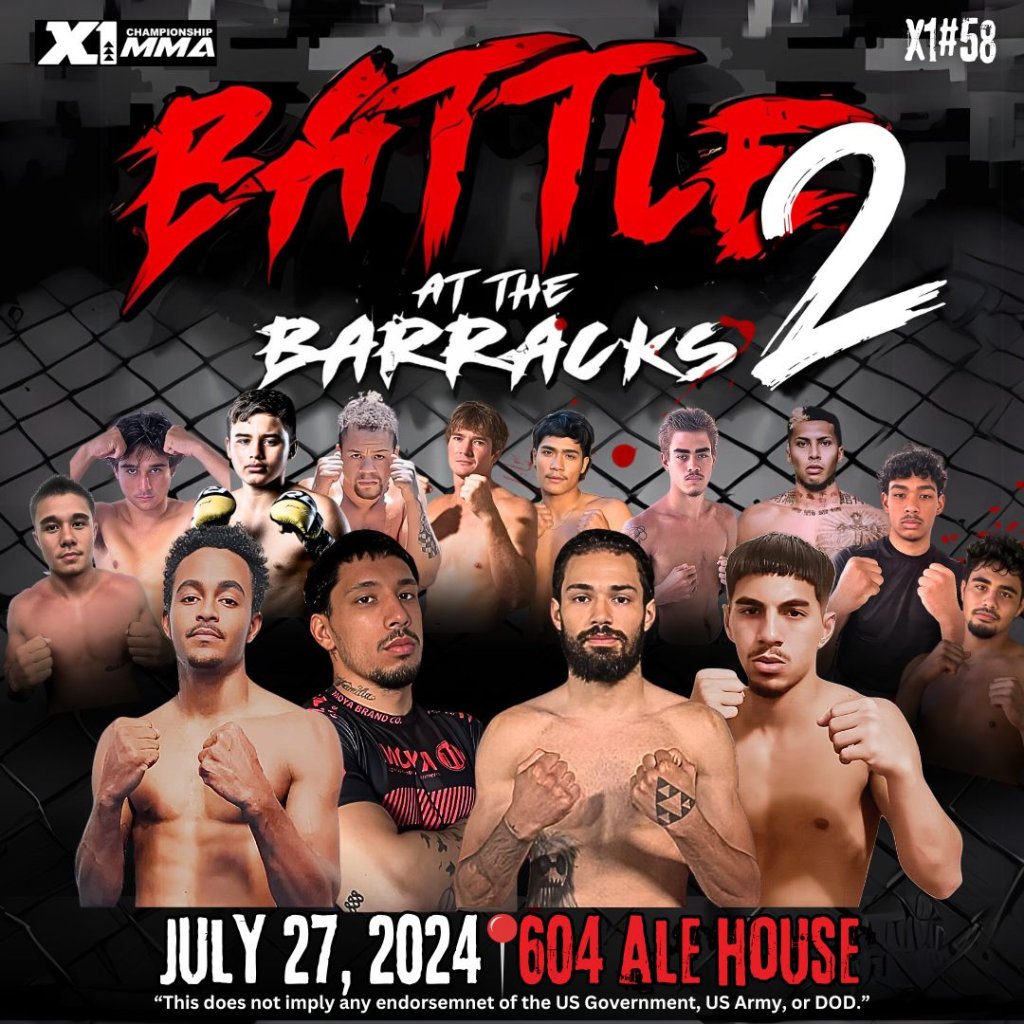 Get ready for an adrenaline-pumping night at X1 58 Battle at the Barracks 2 on July 27, 2024! Join us at 604 Ale House, Schofield Barracks, for an unforgettable evening of amateur MMA action. Check out these thrilling matchups: